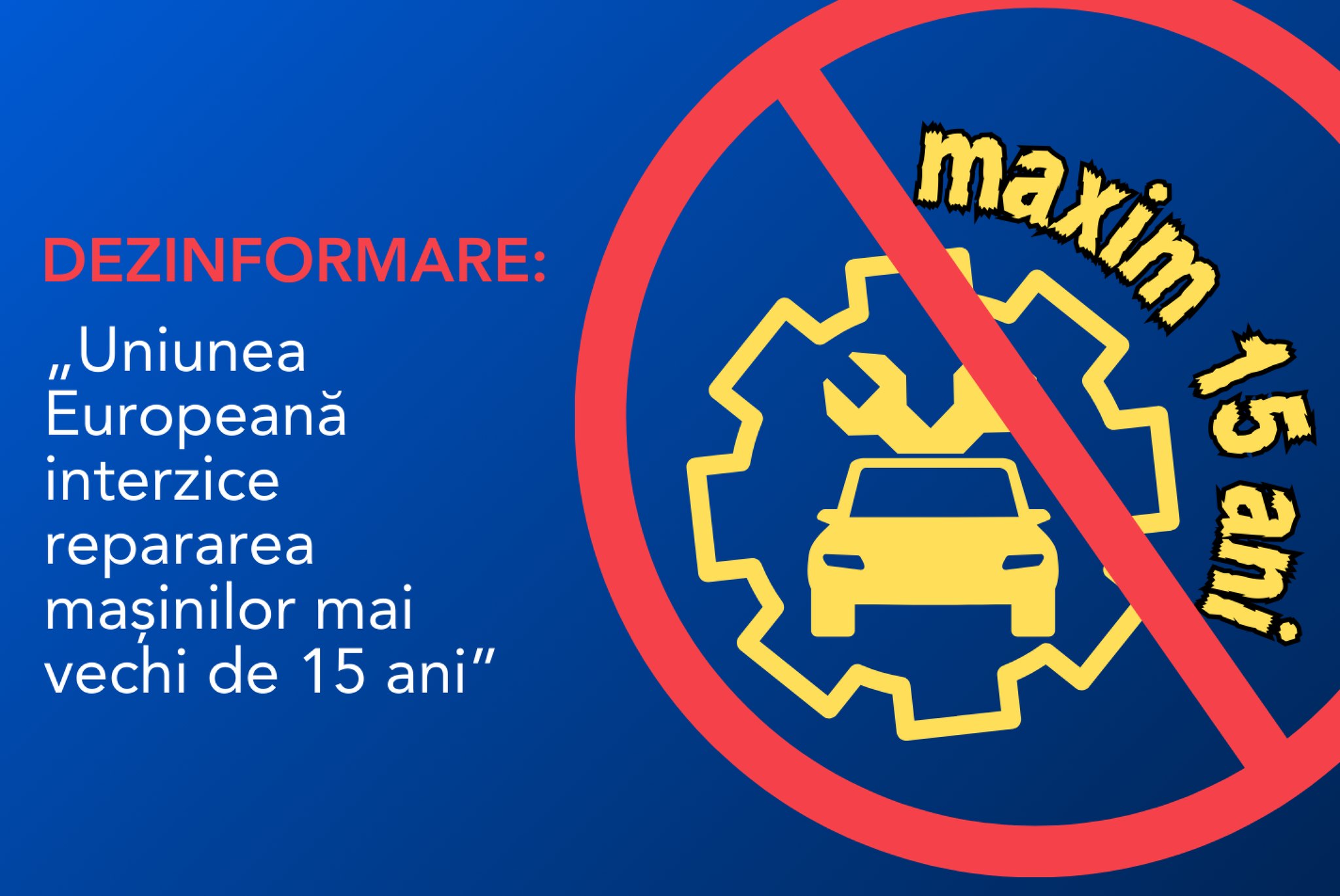 Comisia Europeană în România atrage atenția asupra unei dezinformări care circulă prin mediul online referitoare la mașinile mai vechi de 15 ani. Potrivit CE în România, „nimic din legislația propusă de Comisia Europeană nu împiedică repararea mașinilor de o anumită vechime. Dimpotrivă, mai multe dispoziții vizează facilitarea reparării mașinilor. Vă puteți repara întotdeauna mașina, dacă doriți, chiar dacă acest lucru nu este rentabil”.