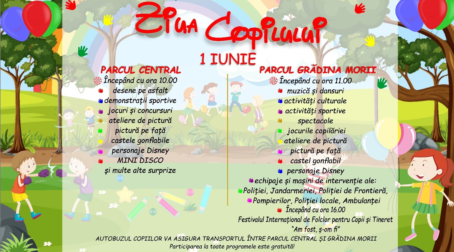 Acestea vor începe la ora 11:00 în Parcul Grădina Morii și la 10:00 în Parcul Central. Programul zilei cuprinde spectacole, activități sportive și jocurile copilăriei și nu vor lipsi castelele gonflabile și personaje Disney.