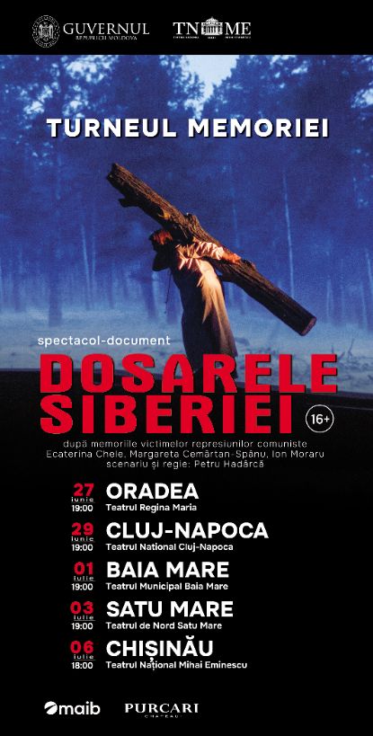 Teatrul Național „Mihai Eminescu” din Chișinău va prezenta spectacolul „Dosarele Siberiei” pe scena Teatrului Municipal Baia Mare în data de 1 iulie a.c., în cadrul Turneului Memoriei. Acesta va începe oficial pe 27 iunie la Oradea, va continua pe 29 iunie la Cluj-Napoca, iar pe 1 iulie în municipiul reședință de județ. Biletele pentru reprezentația de la Baia Mare s-au pus deja în vânzare și pot fi achiziționate accesând site-ul https://www.bilet.ro/eveniment/dosarele-siberiei-15975-51173 . Turneul va ajunge pe 3 iulie la Satu Mare și se va încheia la Chișinău, pe 6 iulie.