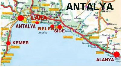 Cea mai apropiata localitate de Antalya este Lara, situata la doar 20-30 de minute de aeroportul international. Statiunea este supranumita si Vegasul turcesc datorita hotelurilor de inalta calitate cu tematica si replici ale obiectivelor turistice populare de pe Glob precum Palatul Venetia, Plaja Titanic, Palatul Topkapi ori Palatul Kremlin.