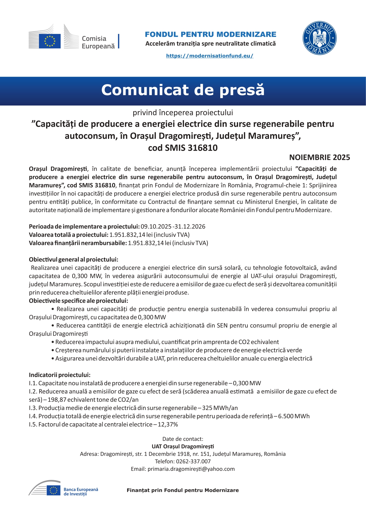 Orașul Dragomirești, din județul Maramureș, a demarat implementarea proiectului „Capacități de producere a energiei electrice din surse regenerabile pentru autoconsum”, finanțat prin Fondul pentru Modernizare. Investiția, în valoare totală de 1,95 milioane lei, vizează instalarea unei centrale fotovoltaice cu o capacitate de 0,300 MW, care va asigura consumul propriu de energie al administrației locale.