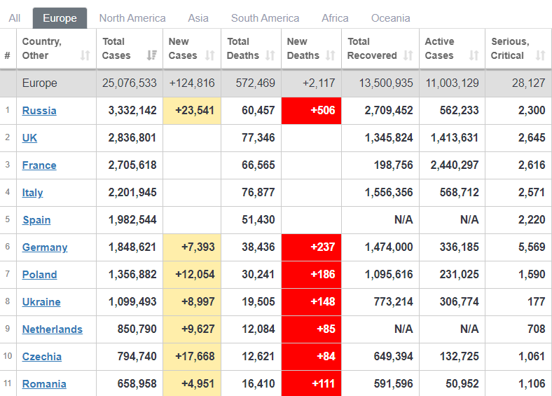 Potrivit bilanțului Reuters, Europa a înregistrat cel puțin 25.016.506 de cazuri de coronavirus și 559.863 de decese, de la începutul pandemiei. În ultimele zile au fost raportate peste un milion de cazuri noi la fiecare patru zile.