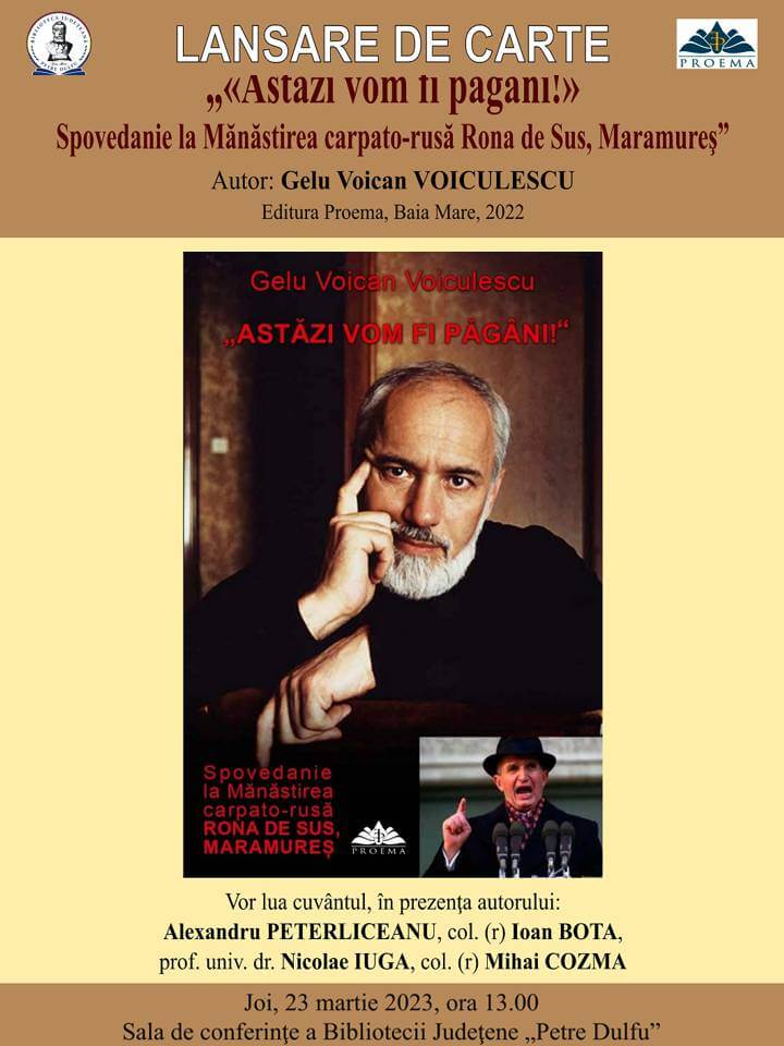 În data de 23 martie, la Biblioteca Județeană „Petre Dulfu” din Baia Mare trebuia să aibă loc evenimentul de lansare a unei cărți scrise de Gelu Voican Voiculescu, personaj controversat, printre altele. La o zi de la anunțarea evenimentului, conducerea Bibliotecii a revenit asupra deciziei și a anunțat oficial că „din rațiuni de diplomație culturală, lansarea cărții „Astăzi vom fi păgâni – spovedanie la Mănăstirea carpato-rusă Rona de Sus”, de Gelu Voican-Voiculescu, eveniment programat joi, 23 martie 2023, ora 13, la Sala de conferințe a Bibliotecii Județene „Petre Dulfu”, nu va mai avea loc”.