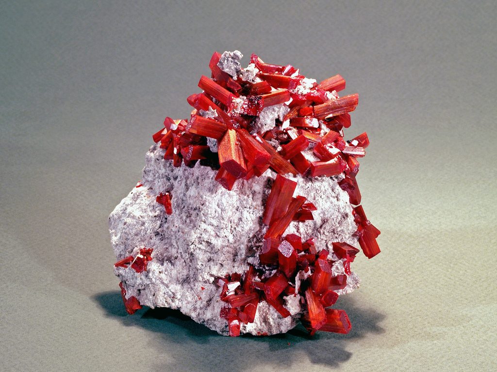 Realgarul (AsS) – este un mineral care face parte din categoria sulfurilor nemetalice. Numele mineralului provine din limba arabă – Radj al ghar și înseamnă pulbere din peșteră. Eşantionul prezintă cristale prismatice striate în lung, crescute radiar, de culoare roșie, dezvoltate pe o matrice de cuarţ milimetric alb.