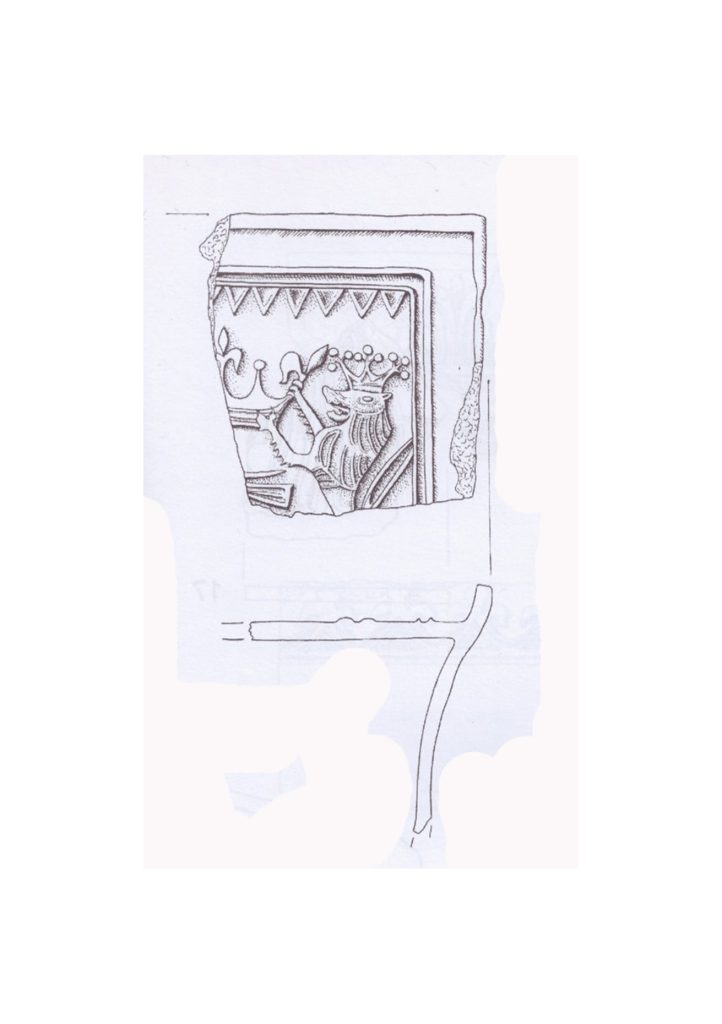 Este vorba despre un fragment a unei cahle plăci nesmălţuită, de culoare cărămizie, descoperit cu ocazia lucrărilor de consolidare și restaurare efectuate în anii 2003-2004 la clădirea din Piața Libertății nr. 15 din Baia Mare, cunoscută sub numele de Casa Lendvay. Aceasta are un chenar simplu, în relief, lat de 0,7 cm, toată imaginea fiind încadrată de două chenare succesive. Lățimea fragmentului este de 13 cm, iar lungimea de 14,6 cm. Pe verso se păstrează o parte din piciorul tronconic.