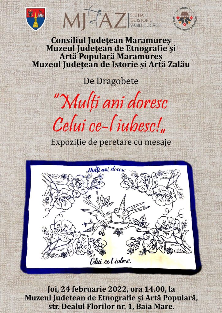 Joi, 24 februarie 2022, Consiliul județean Maramureș prin Muzeul Județean de Etnografie și Artă Populară Maramureș, în parteneriat cu Muzeul Județean de  Istorie și Artă Zalău, vă invită la vernisajul expoziției de ”păretare”, ”De Dragobete Mulți ani doresc/Celui ce-l iubesc”, care va avea loc începând cu ora 14:00.