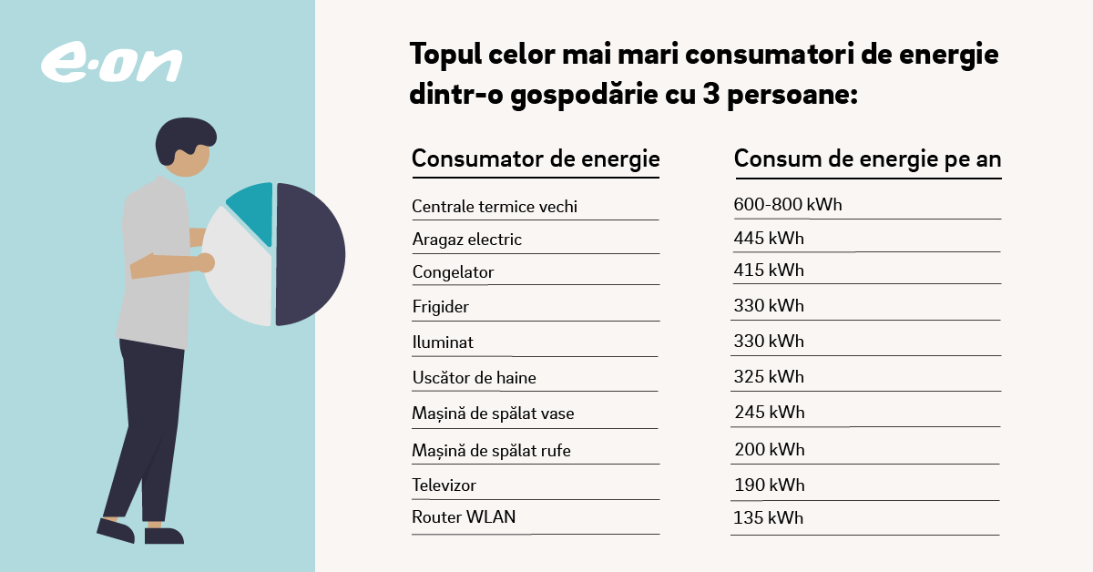Pentru o gospodărie cu dotări moderne, în care locuiesc trei persoane, consumul anual de energie electrică este de aproximativ 3.400 kWh, conform unor estimări realizate de instituții internaționale. Este însă posibil să reducem simțitor consumul, chiar cu până la 30%, dacă aplicăm câteva măsuri. O spun cei de la E-ON, care îți arată cum să îți reduci consumul de energie și astfel vei plăti mai puțin la factură.