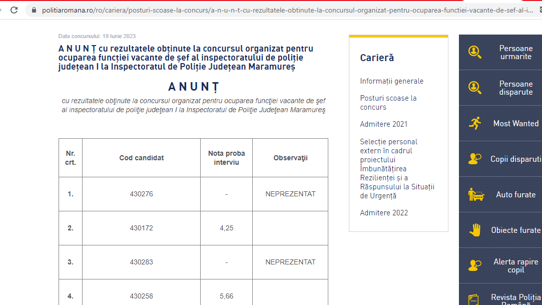 Poliția Română publica în data de 19 iunie un anunț cu rezultatele obţinute la concursul organizat pentru ocuparea funcţiei vacante de şef al inspectoratului de poliţie judeţean I la Inspectoratul de Poliţie Judeţean Maramureş. Din lista publicată vedem că s-au înscris 4 candidați, însă doar doi s-au prezentat la concurs, iar ambii au luat note care nu le fac cinste.