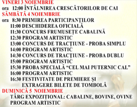 Vineri, 3 noiembrie, va fi dedicată întâlnirii crescătorilor de cai, iar sâmbătă va fi o zi plină (în intervalul orar 08.30 – 16.30) din care nu vor lipsi probele de tracțiune și proba de ”cel mai puternic cal”.