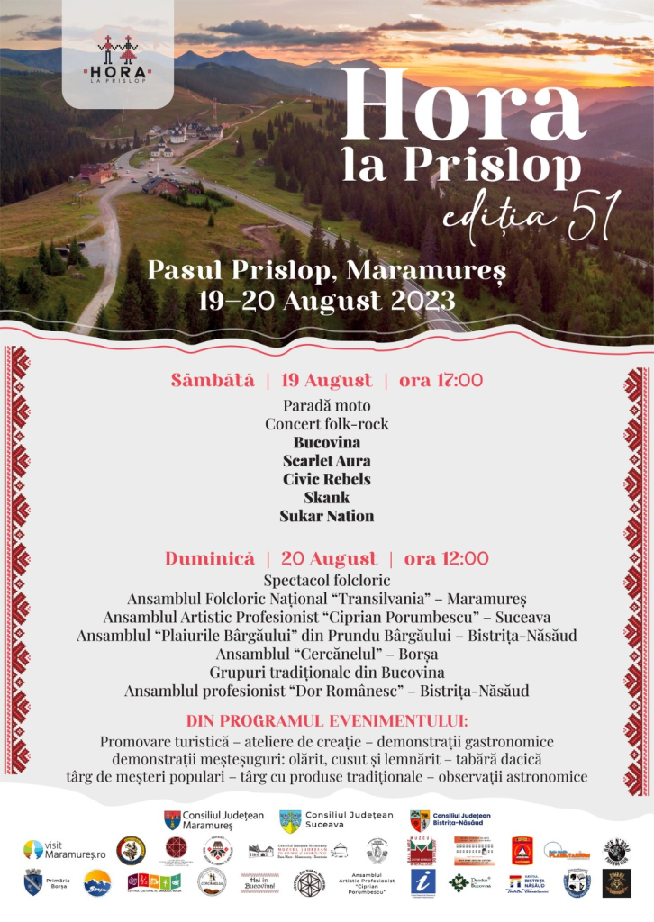 În perioada 19-20 august 2023 voia bună va fi readusă în Pasul Prislop! Festivalul Interjudețean Hora la Prislop ajunge la cea de-a 51-a ediție și promite un program cu multe surprize.