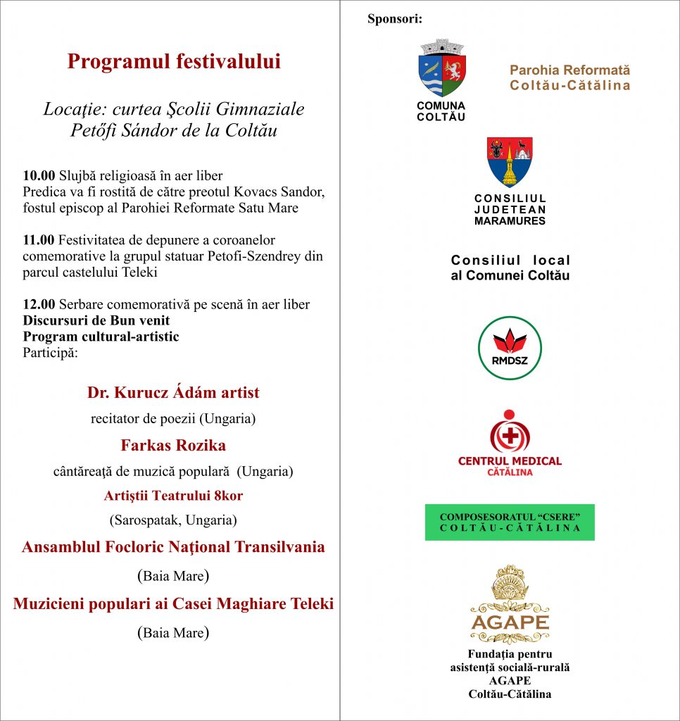 Consiliul Județean Maramureș prin Ansamblul Folcloric Național ”Transilvania”, în parteneriat cu Primăria Coltău vă invită să participați la ”Festivitatea de comemorare a poetului Petöfi Sándor”, care se va desfășura în perioada 4 – 5 septembrie 2021. Activitățile din cadrul evenimentului se vor desfășura în curtea Castelului Teleki și a Școlii Gimnaziale Petöfi Sándor.