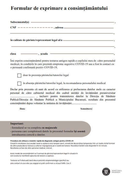 ”Îmi exprim consimțământul pentru testarea antigen rapidă a copilului meu de către personalul medical, în condițiile în care prezintă simptome sugestive COVID-19 sau a fost în contact cu o persoană confirmată pozitiv COVID-19,