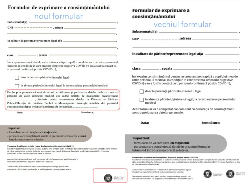 De data aceasta, spre deosebire de precedentul formular retras din folosință cu scandal, pe acesta apare doar sigla Ministerului Sănătății, nu și cea a Ministerului Educației.
