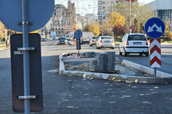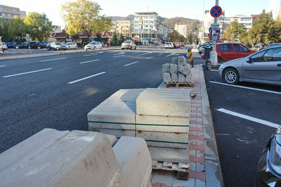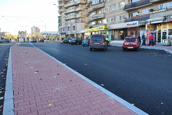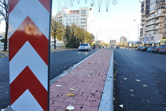 Acum s-au ingustat trotuarele, amenajandu-se parcari, iar drumul a fost latit. O idee buna si care ar fi trebuit sa ramana la acest stadiu. Dar, nu. Tocmai cand incepeam sa apreciem initiativa Primariei de a extinde drumul si de a fluidiza traficul, ni se ofera si explicatia pentru care bulevardul a capatat alte proportii: sa mai incapa niste borduri si pe mijlocul drumului, unde s-au creat scuare de dimensiuni impresionante, unele avand 2-3 m latime.