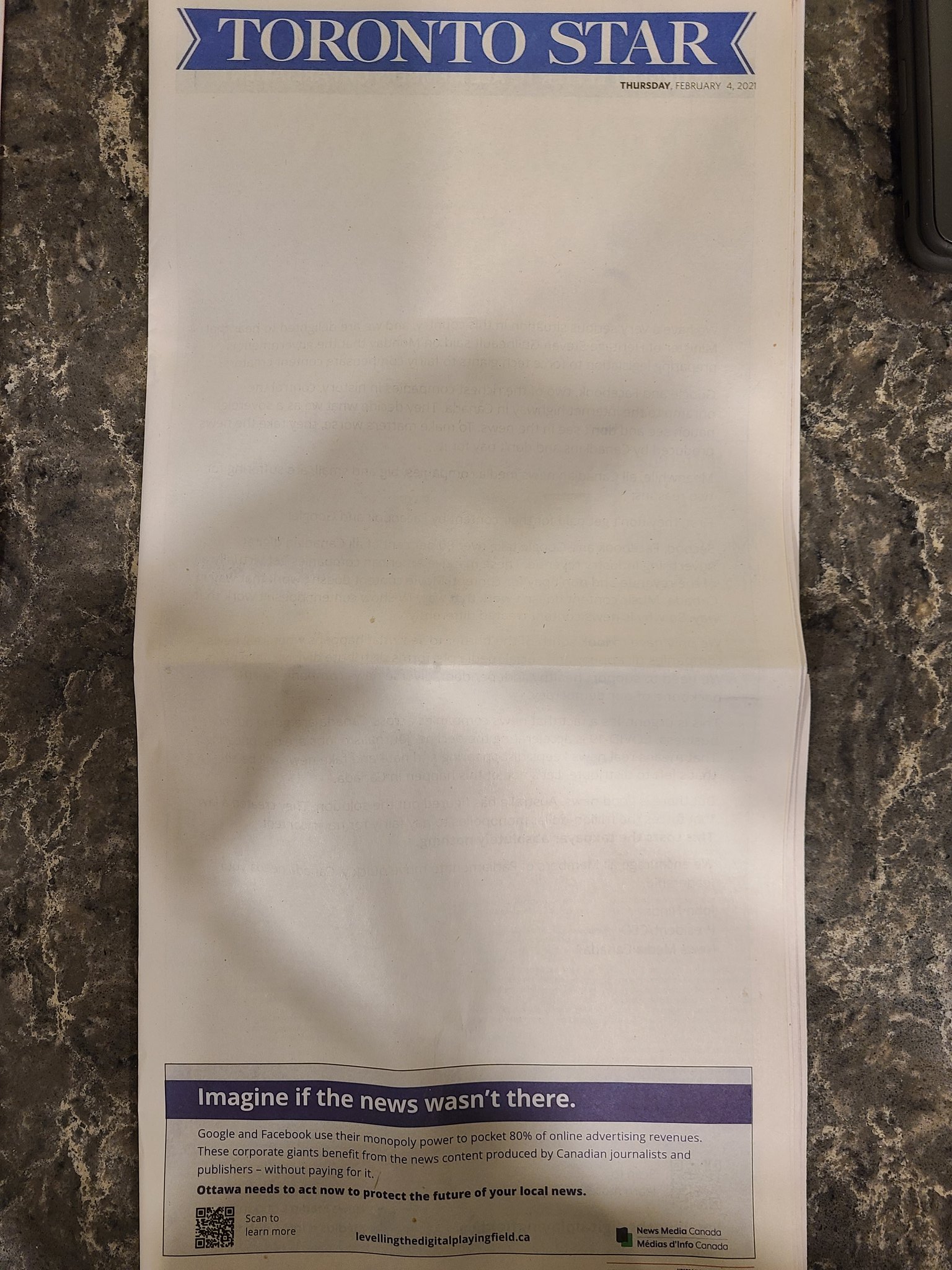 Imaginea zilei: Cotidianul canadian Toronto Star a ieșit ieri cu prima pagină goală, pentru a protesta împotriva Google și Facebook