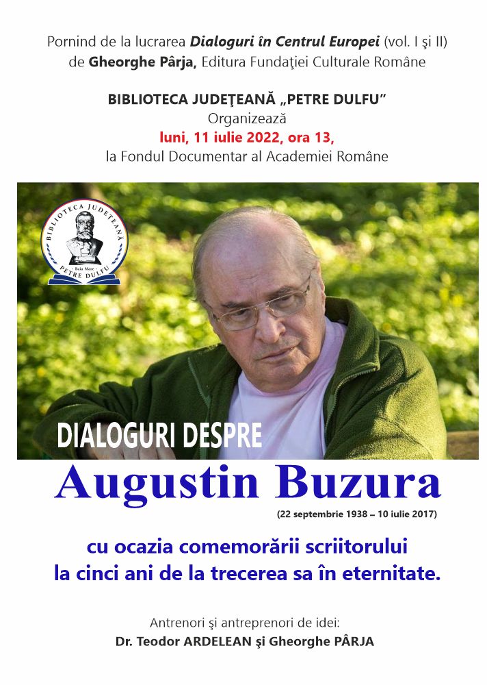 Moment în memoria celui care a fost Augustin Buzura la Biblioteca Județeană Baia Mare luni, 11 iulie, cu începere de la ora 13.00, la Fondul Documentar al Academiei Române. Pornind de la cartea „Dialoguri în Centrul Europei” (vol. I și II), de Gheorghe Pârja, Editura Fundației Culturale Române, Biblioteca Județeană „Petre Dulfu” organizează maine activitatea „DIALOGURI DESPRE AUGUSTIN BUZURA” (22 septembrie 1938 – 10 iulie 2017), cu ocazia comemorării scriitorului la cinci ani de la trecerea sa în eternitate.