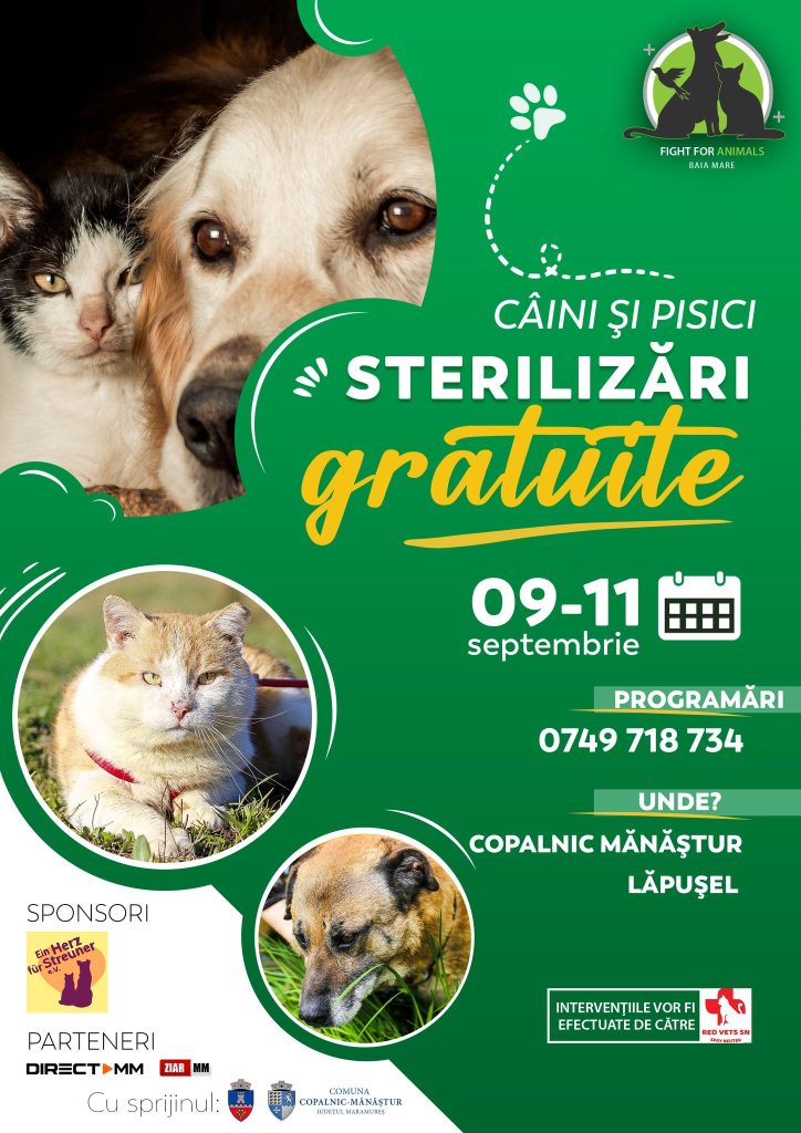 „Acțiunea va avea loc în data de 09 septembrie la Copalnic Mănăștur în incinta Caminului Cultural, locație pusă la dispoziţie de către Primaria Comunei Copanic Mănăștur și 10-11 septembrie, în satul Lăpușel din Comuna Recea, în incinta Căminului cultural, locație oferită de către Primăria Comunei Recea. Vom încerca să asigurăm toaletarea urechilor, tăierea unghiilor. Vom deparazita extern animăluţele fără stăpân, iar pentru animalele fără stăpân vom asigura transportul pe raza comunei Recea celor care nu au posibilitate! STERILIZAREA ESTE OBLIGATORIE PRIN LEGE! NU hrăniti animalele cu 12 ore înainte de intervenţie!”, spun cei de la Asociația Fight for Animals.