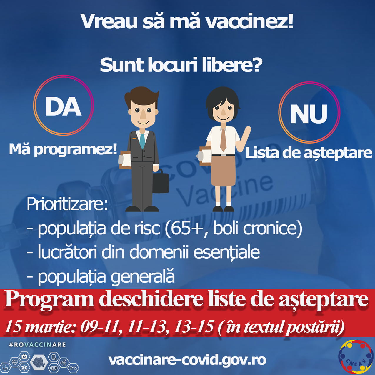 Listele de așteptare pentru vaccinare se deschid succesiv, în ordinea alfabetică a județelor, începând de la ora 9.00, a anunțat Comitetul de coorodonare a campaniei de vaccinare (CNCAV).
