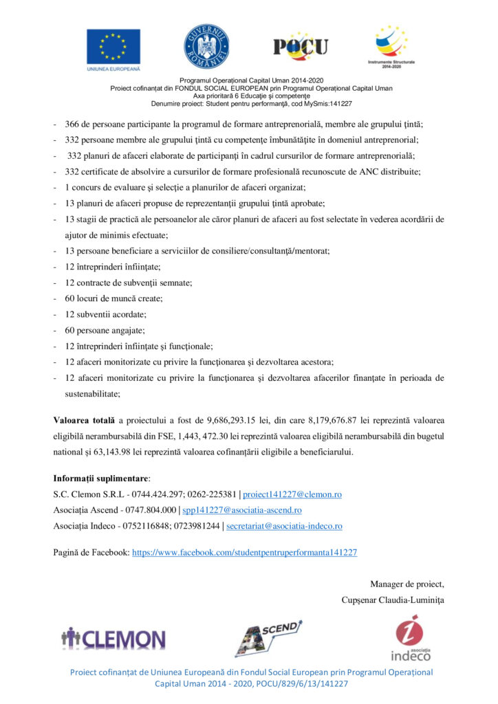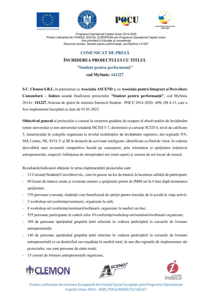 S.C. Clemon S.R.L. în parteneriat cu Asociația ASCEND și cu Asociația pentru Integrare și Dezvoltare Comunitară – Indeco anunţă finalizarea proiectului ”Student pentru performanță”, cod MySmis 2014+: 141227, Schema de ajutor de minimis Innotech Student – POCU 2014-2020, AP6, OS 6.13, care a fost implementat începând cu data de 01.01.2022.
