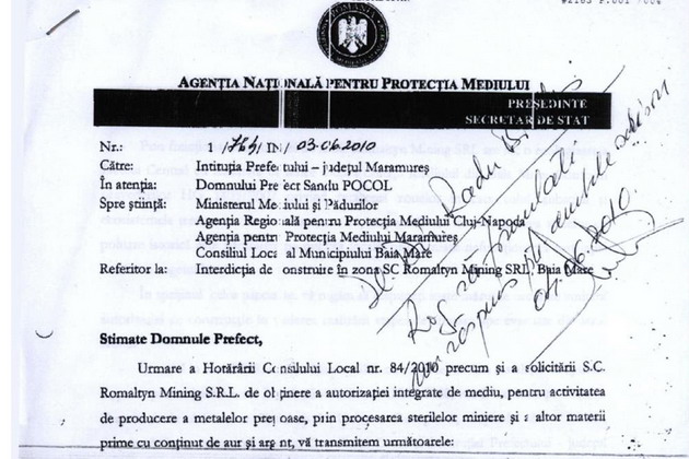Presiunile pentru deschiderea activitatii societatii Romaltyn Mining in Baia Mare vin mai nou de la centru. Intr-o adresa datand din 3 iunie, Iosif Nagy, presedintele Agentiei Nationale pentru Protectia Mediului, impune autoritatilor judetene emiterea autorizatiilor de construire, in vederea reluarii activitatii de obtinere a aurului pe baza de cianura.