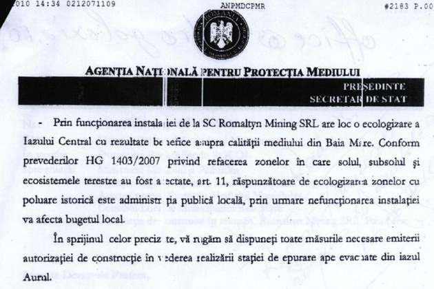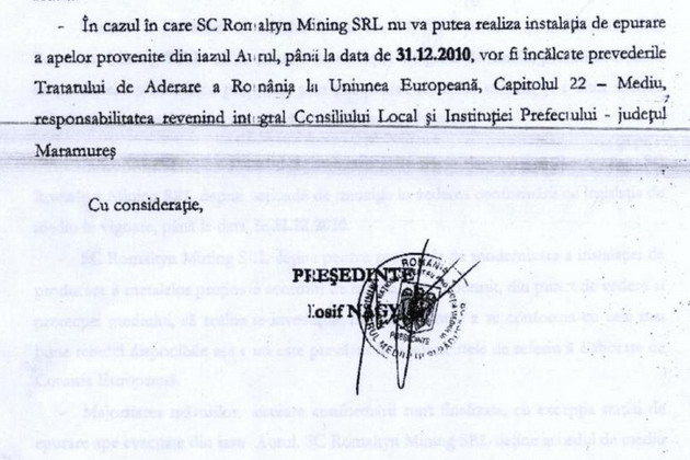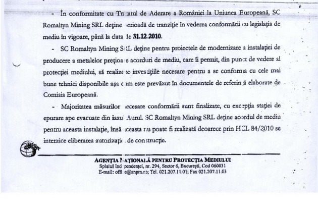 In acelasi act se aminteste si faptul ca in cazul in care Romaltyn Mining nu va putea realiza instalatia de epurare a apelor provenite din Iazul Aurul pana la data de 31 decembrie 2010, vor fi incalcate prevederile Tratatului de Aderare a Romaniei la UE.