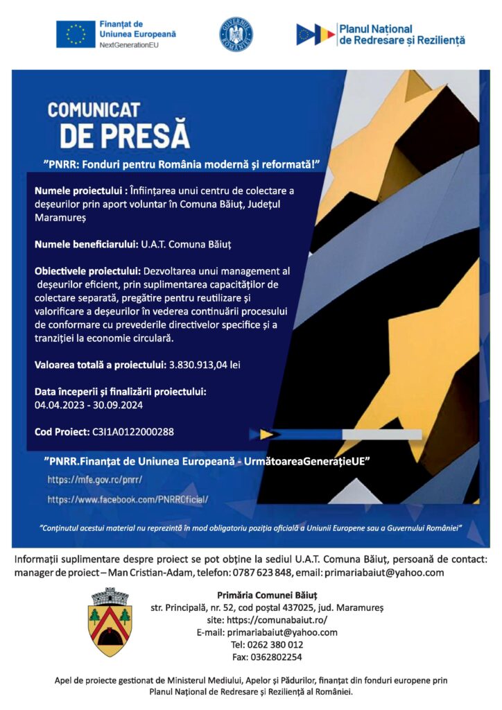 Înființarea unui centru de coelctare a deșeurilor prin aport voluntar în Comuna Băiuț, județul Maramureș