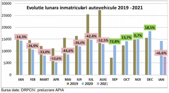 Asociația Producătorilor și Importatorilor de Autoturisme precizează că în luna ianuarie au fost comercializate doar 5.913 autoturisme, cu 52,2% mai puține decât anul trecut, și 1.305 autovehicule comerciale ușoare (15,8% – o scădere semnificativă, dar mai puțin abruptă decât autoturismele).