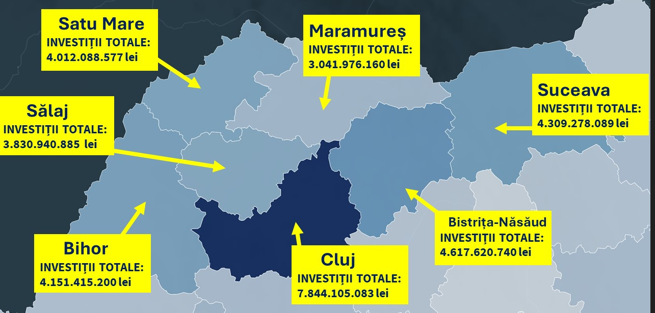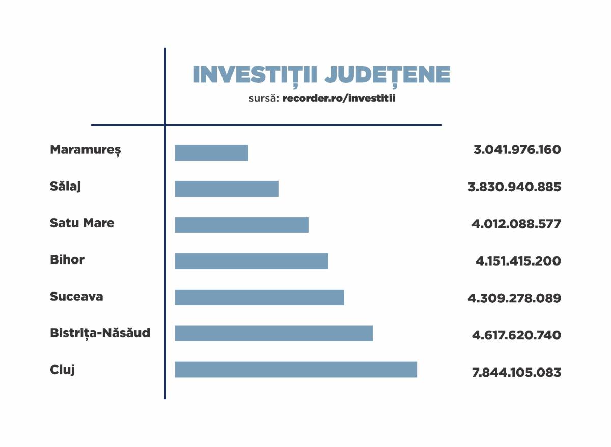 După cum se poate constata din grafica de mai sus, la capitolul investiții, pe locul I se află Clujul, în timp ce Maramureșul ocupă ultimul loc. Din cuantumul investițiilor din Maramureș, jumătate reprezintă fonduri europene, iar restul sunt finanțări naționale sau locale.