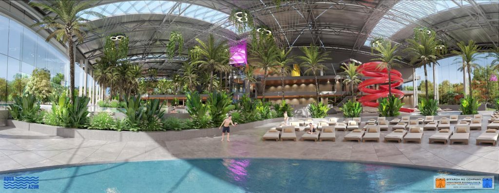 ZONA DE AGREMENT EXTERIOARĂ, care cuprinde 2000 de utilizatori simultan, va fi dotată cu: 3 bazine exterioare (piscină de relaxare, piscină cu valuri), bazin pentru ansamblu tobogane, spații comerciale, terenuri de sport, terase exterioare și spații verzi. De asemenea, vor fi realizate 556 de locuri de parcare pentru autoturisme, din care 26 de locuri vor fi pentru persoanele cu handicap, și alte 10 locuri de parcare vor fi destinate autobuzelor.