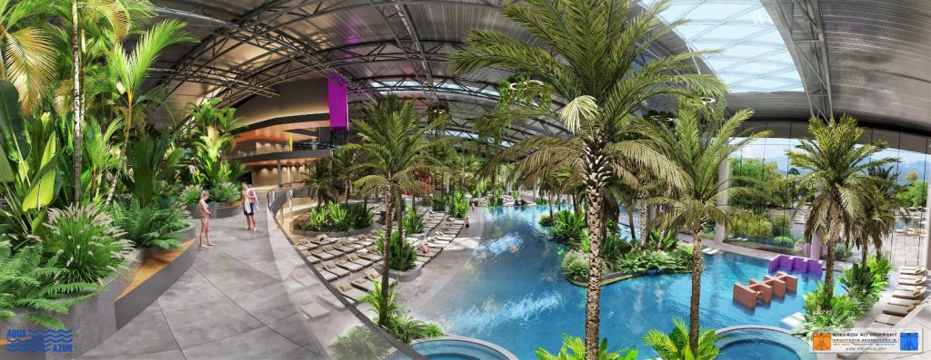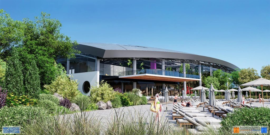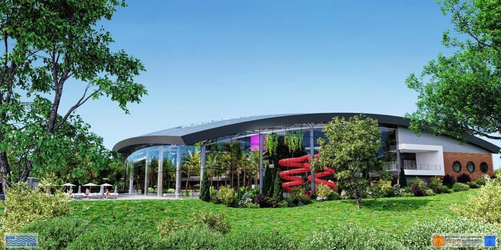 ZONA DE AGREMENT EXTERIOARĂ, care cuprinde 2000 de utilizatori simultan, va fi dotată cu: 3 bazine exterioare (piscină de relaxare, piscină cu valuri), bazin pentru ansamblu tobogane, spații comerciale, terenuri de sport, terase exterioare și spații verzi. De asemenea, vor fi realizate 556 de locuri de parcare pentru autoturisme, din care 26 de locuri vor fi pentru persoanele cu handicap, și alte 10 locuri de parcare vor fi destinate autobuzelor.