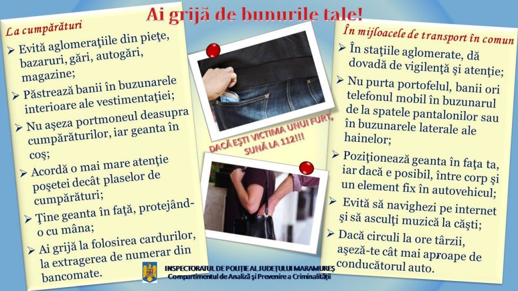 Pentru ca bunurile dumneavoastră să fie mereu în siguranţă, Poliţiştii Compartimentului de Analiză şi Prevenire a Criminalităţii reamintesc câteva măsuri de prevenire a furturilor din buzunare şi poşete. Însă, nu uita că principalul responsabil pentru siguranţa bunurilor tale eşti chiar tu!