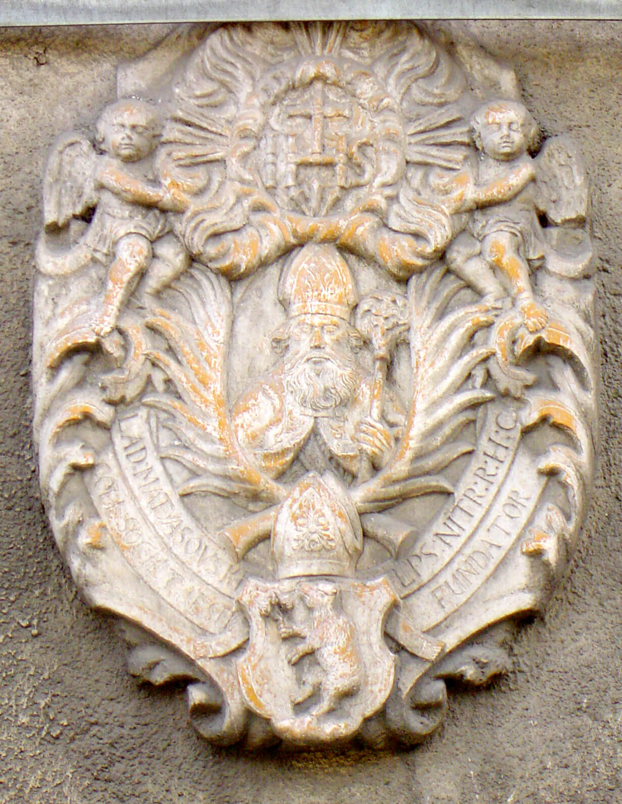 „În partea vestică a clădirii Residentia din Baia Mare, sub fereastra din mijloc, s-a amplasat o placă sculptată în piatră, de mari dimensiuni, de formă ovală. Emblema heraldică, redată în basorelief prezintă în mijloc portretul episcopului de Nitra, Mattyasovszky László (Ladislav Maťašovský) (1641-1705, episcop de Nitra: 1696-1705), purtând mitra episcopală și ținând în mâna stângă paterița. Sub portret, la baza plăcii se află stema episcopului: scut renascentist, în câmpul căruia se află un urs întreg, întors spre dextra, rampant, ținând în laba dreaptă ridicată trei trandafiri.