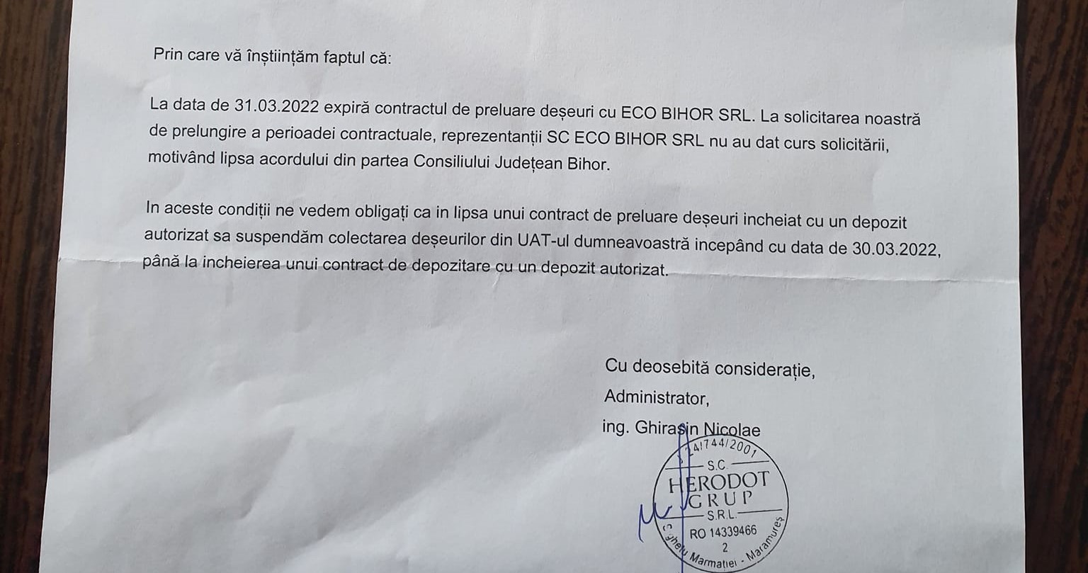 În informarea trimisă primărilor, se arată că „la data de 31 martie 2022 expiră contractul de preluare deșeuri cu ECO BIHOR SRL. La solicitarea noastră de prelungire a perioadei contractuale, reprezentanții ECO BIHOR SRL nu au dat curs solicitării, motivand lipsa acordului din partea Consiliului Județean Bihor. În aceste condiții ne vedem obligați ca în lipsa unui contract de preluare deșeuri încheiat cu un depozit autorizat să suspendăm colectarea deșeurilor din UAT-uri începand cu 30 martie 2022.