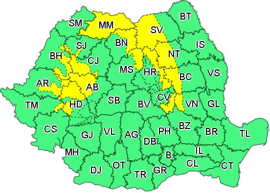 Judeţele care vor intra sub Cod galben sunt: Alba, Bistriţa-Năsăud, Harghita, Sălaj, Arad, Cluj, Maramureş, Suceava, Bacău, Covasna, Mureş, Timiş, Bihor, Hunedoara, Neamţ şi Vrancea.
