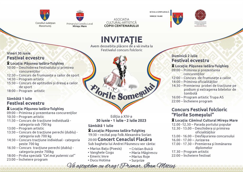 În perioada 1-3 iulie, în comuna Mireșu Mare are loc Festivalul concurs folcloric Florile Someșului, care va cuprinde mai multe mainfestări.
