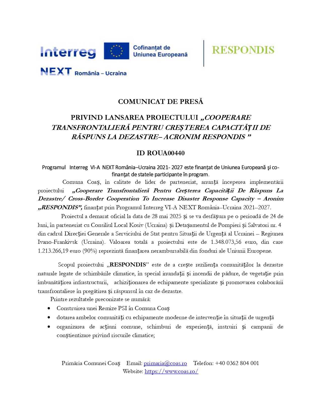 Comuna Coaș, în calitate de lider de parteneriat, anunță începerea implementării proiectului „Cooperare Transfrontalieră Pentru Creșterea Capacității De Răspuns La Dezastre/ Cross-Border Cooperation To Increase Disaster Response Capacity – Aronim „RESPONDIS”, finanțat prin Programul Interreg VI-A NEXT România–Ucraina 2021–2027.