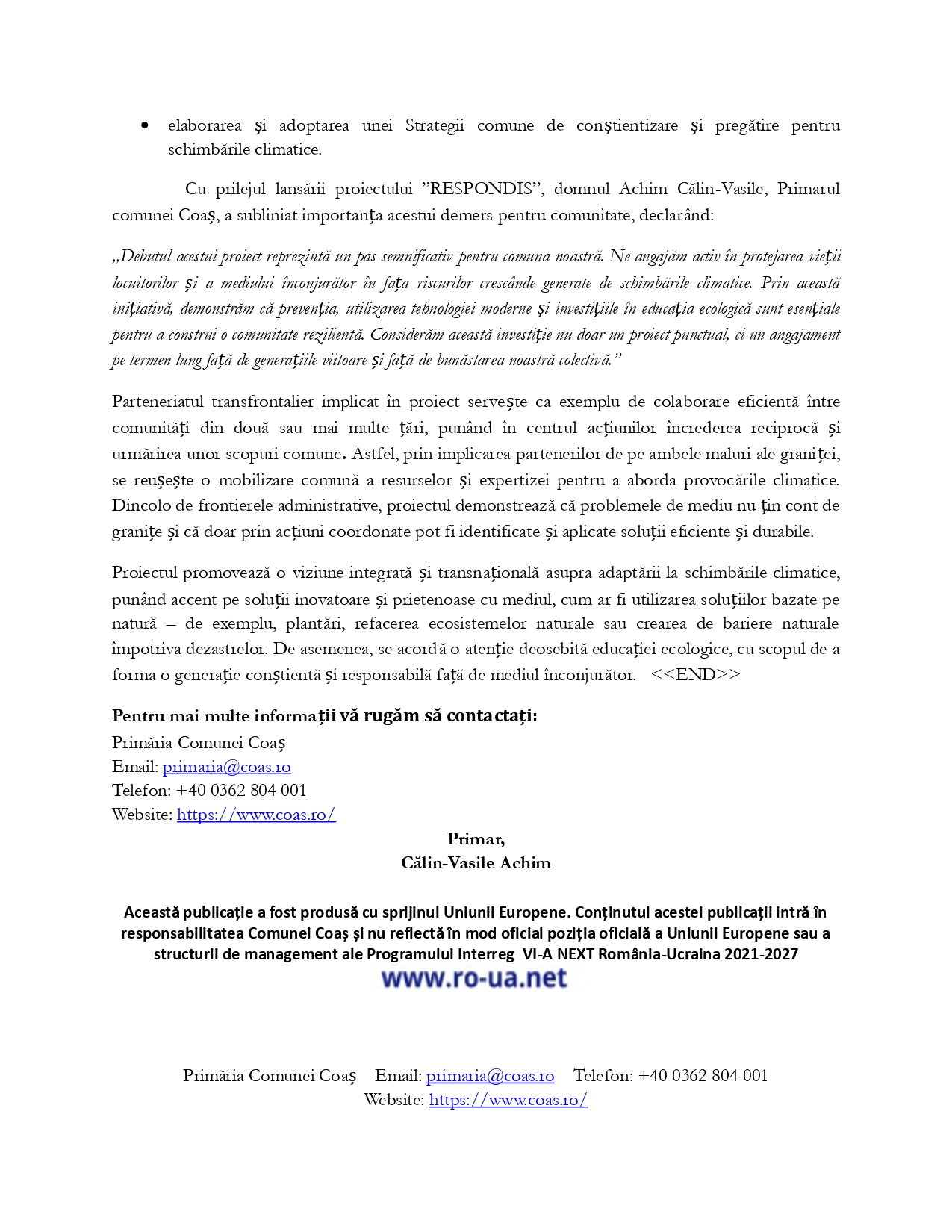 Această publicație a fost produsă cu sprijinul Uniunii Europene. Conținutul acestei publicații intră în responsabilitatea Comunei Coaș și nu reflectă în mod oficial poziția oficială a Uniunii Europene sau a structurii de management ale Programului Interreg VI-A NEXT România-Ucraina 2021-2027