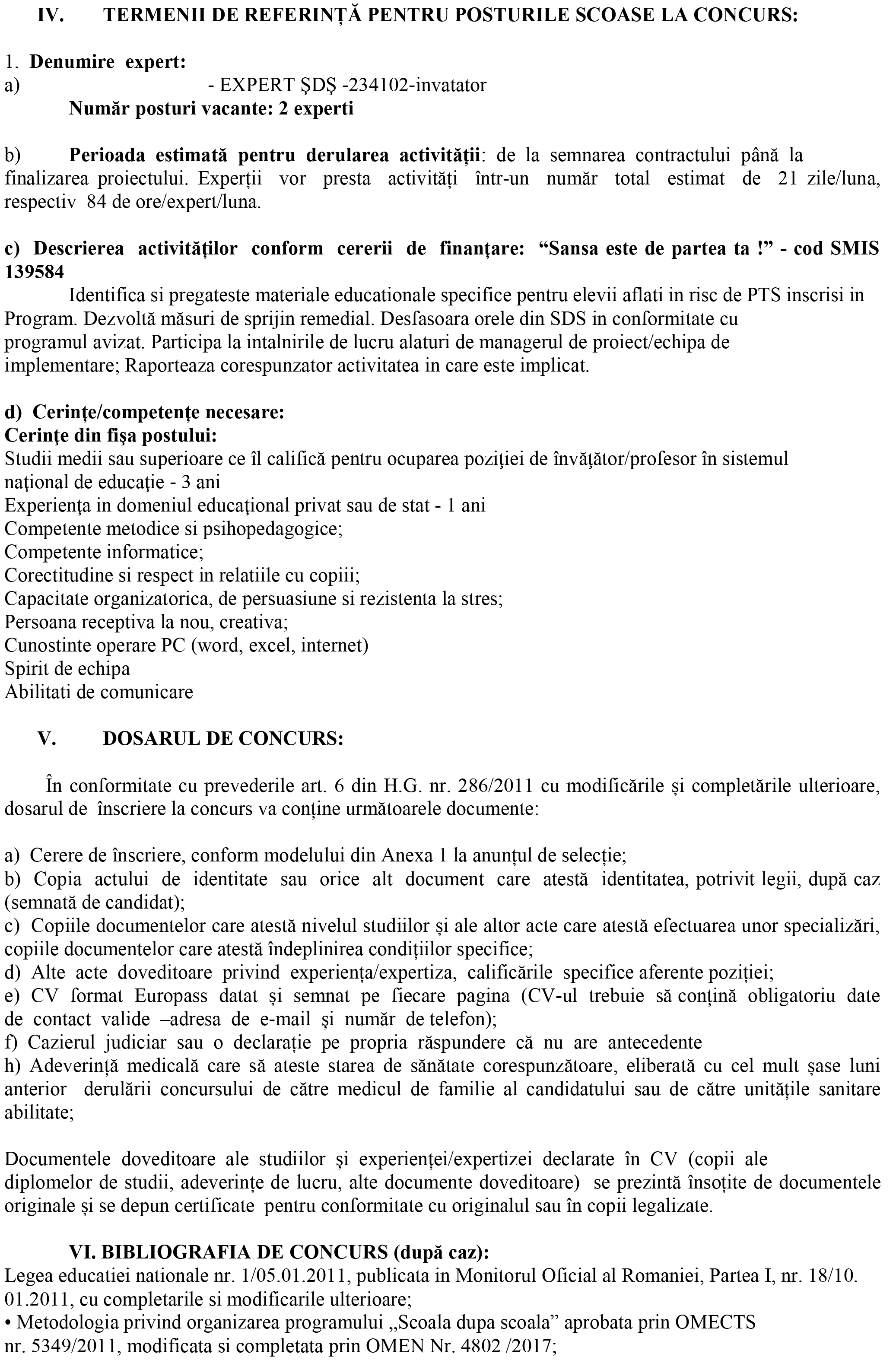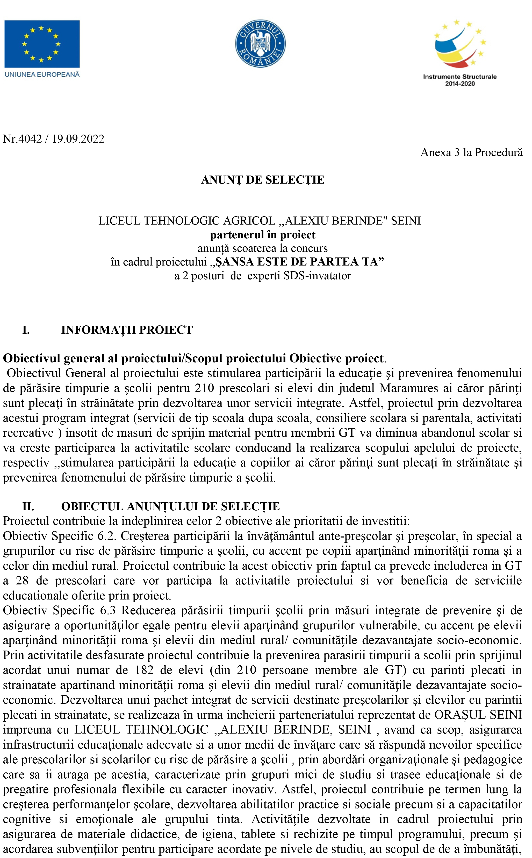 Liceul Tehnologic Agricol ”Alexiu Berinde” Seini, partener în cadrul proiectului ”Șansa este de partea ta”, anunță scoaterea la concurs a două posturi de experți SDS – învățător.