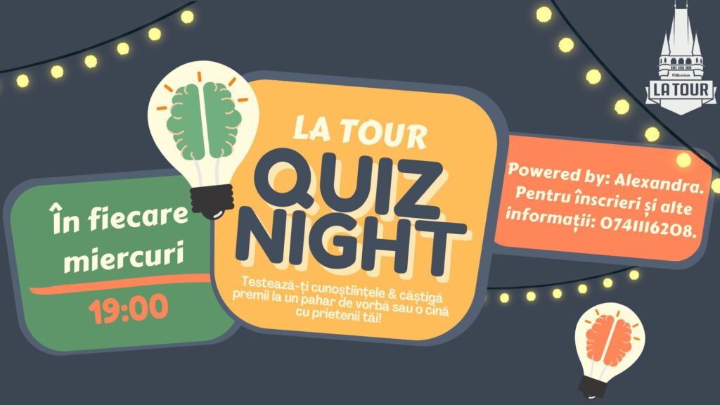 Localul La Tour din Centrul Vechi al orașului Baia Mare organizează miercuri, 22 noiembrie, de la ora 19:00, evenimentul Quiz Night, în care îți poți testa cunoștințele în timp ce stai la masă cu prietenii.