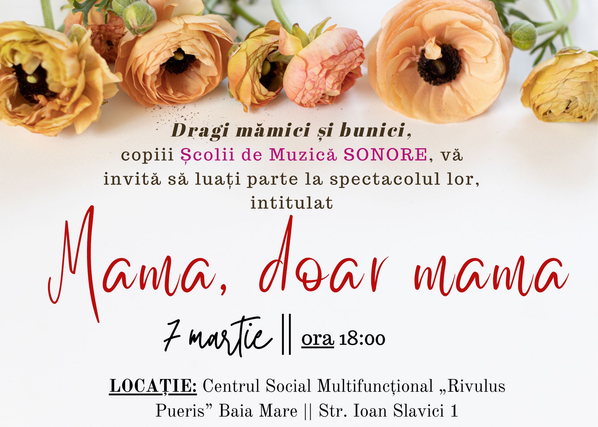 Elevii Școlii de Muzică Sonore Baia Mare invită mămicile și bunicile la spectacolul „Mama, doar mama”.