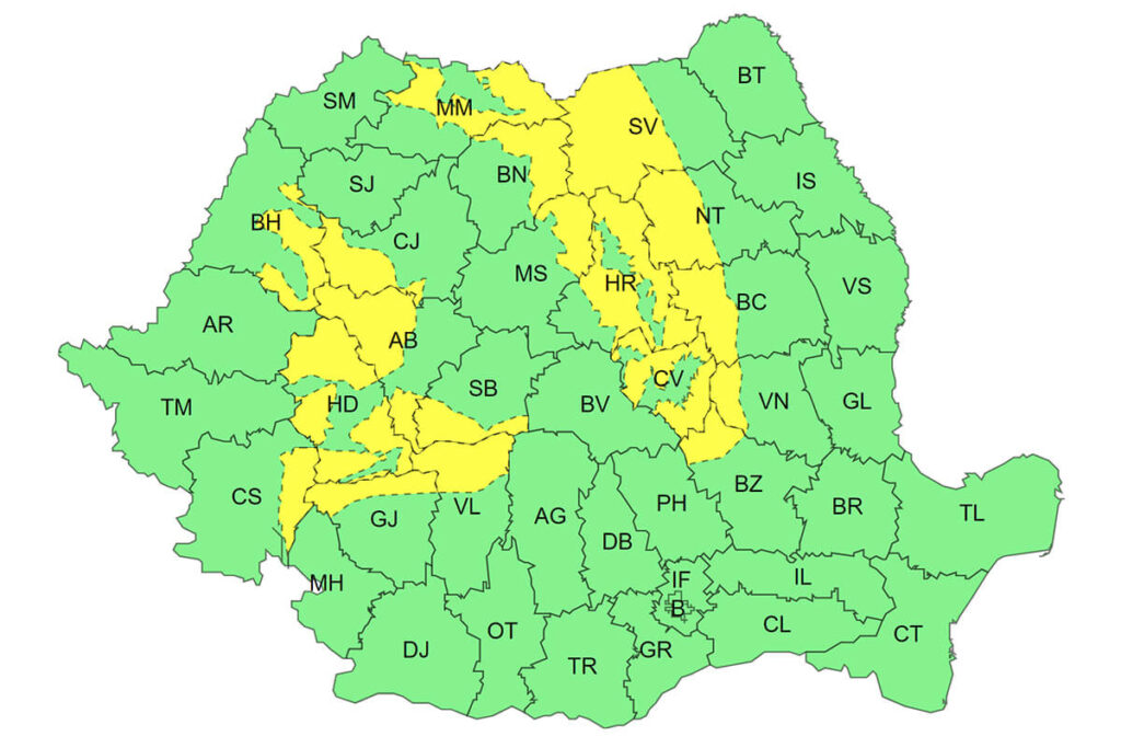 Aproape toate județele României pe raza cărora se întind Munții Carpați se află sub cod galben de vreme severă, anunță specialiștii Administrației Naționale de Meteorologie. Județul Maramureș este și el pe listă, însă aici nu doar zonele montane vor fi afectate, ci și cele de podiș și câmpie.