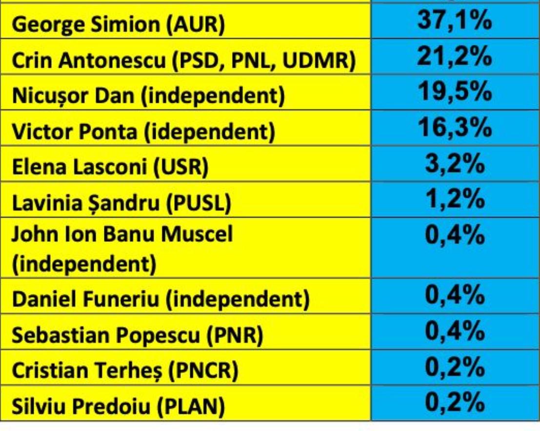 Conform ultimelor sondaje, George Simion (AUR) conduce în opțiunile alegătorilor, fiind secondat de Crin Antonescu (PSD, PNL, UDMR).