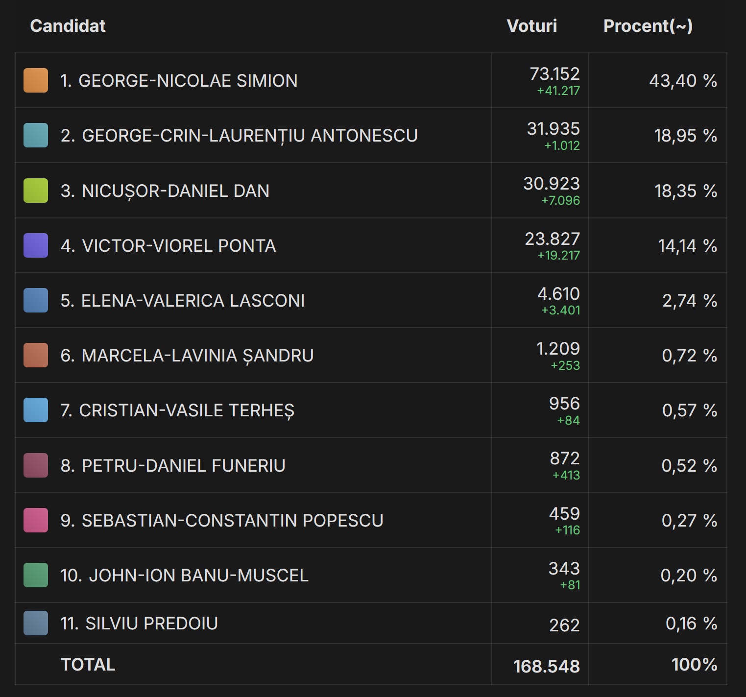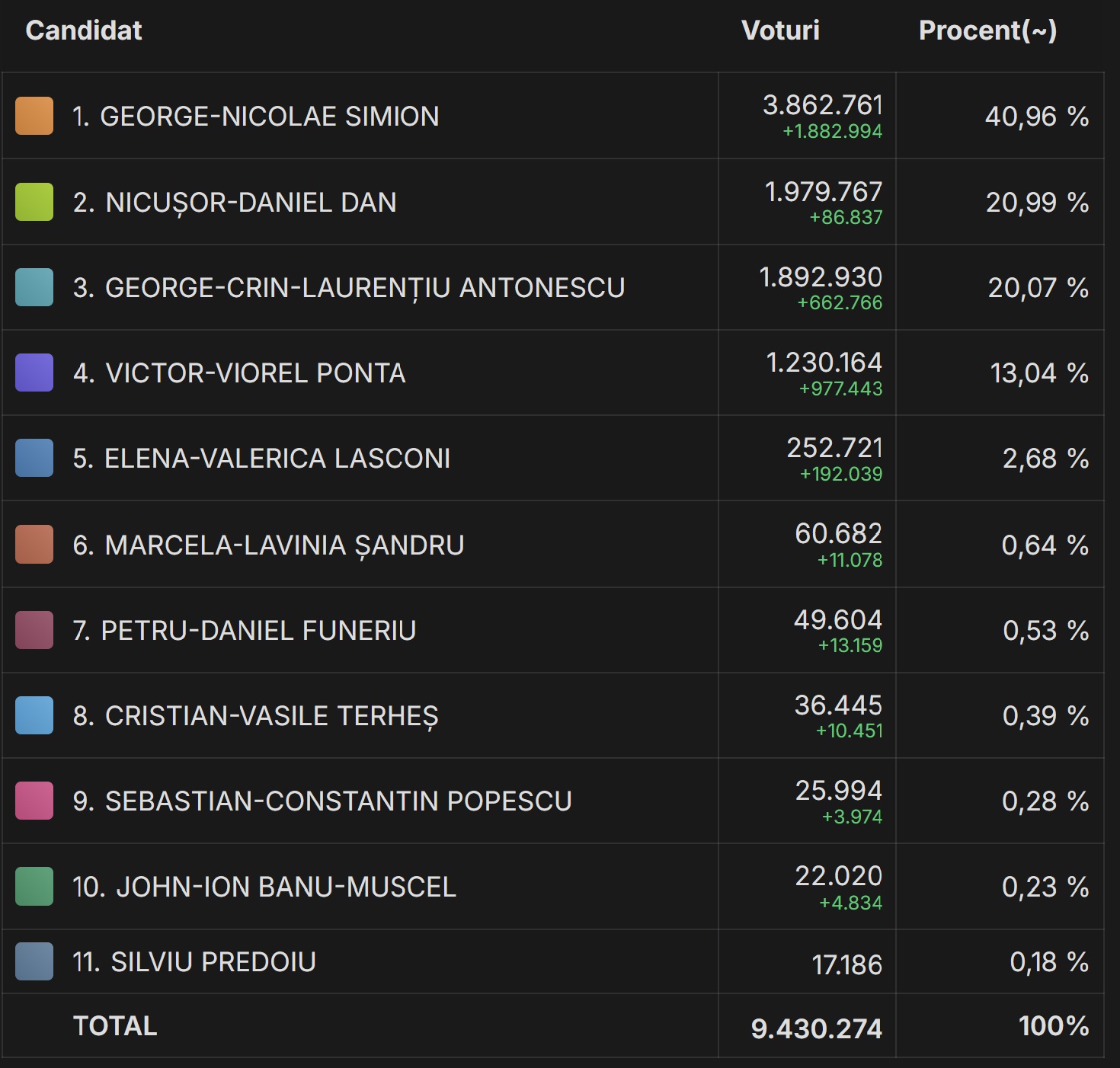Primele rezultate îl arată pe candidatul George Simion pe primul loc, cu aproximativ 40 de procente. Lupta pentru turul al doilea se duce între Crin Antonescu și Nicușor Dan. Diferența dintre cei doi este de câteva mii de voturi. La nivel național, ecartul este infirm.