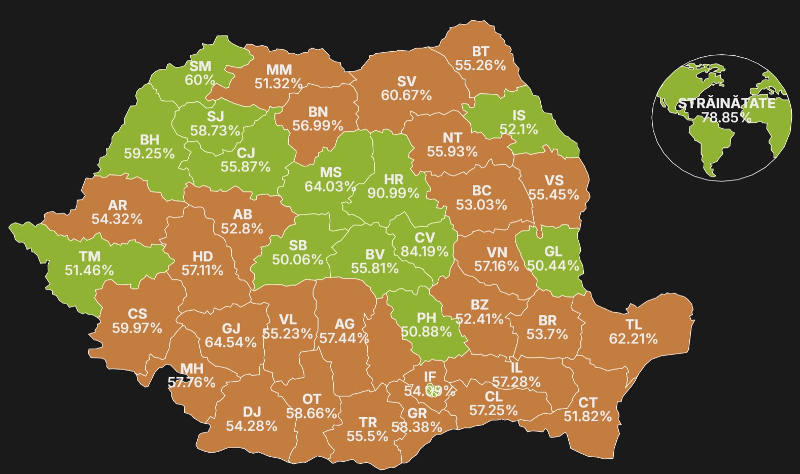 Nicușor Dan a câștigat detașat, fiind primul în 62 din 6 regiuni. Culoarea verde de pe harta de mai jos arată voturile pentru acesta.