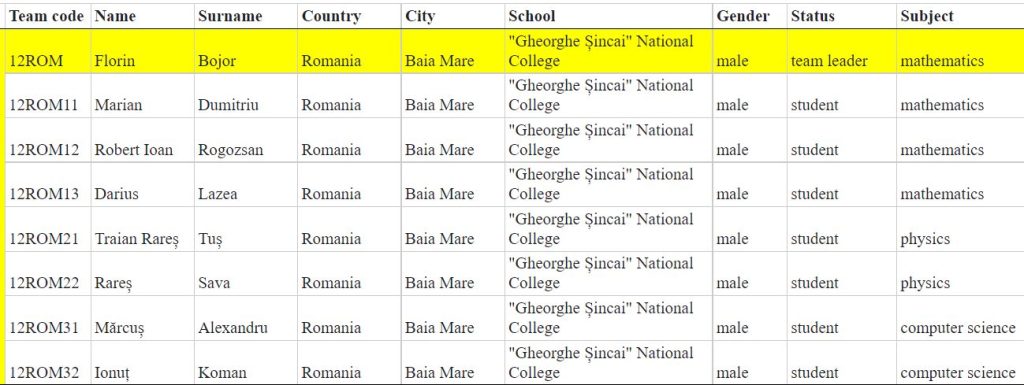 Colegiul Naţional „Gheorghe Şincai” Baia Mare a fost reprezentat de echipa alcătuită din: Marian Dumitriu, Robert Ioan Rogozsan, Darius Lazea, Traian Rare Tuş, Rareş Sava, Mărcuş Alexandru şi Ionuţ Koman.