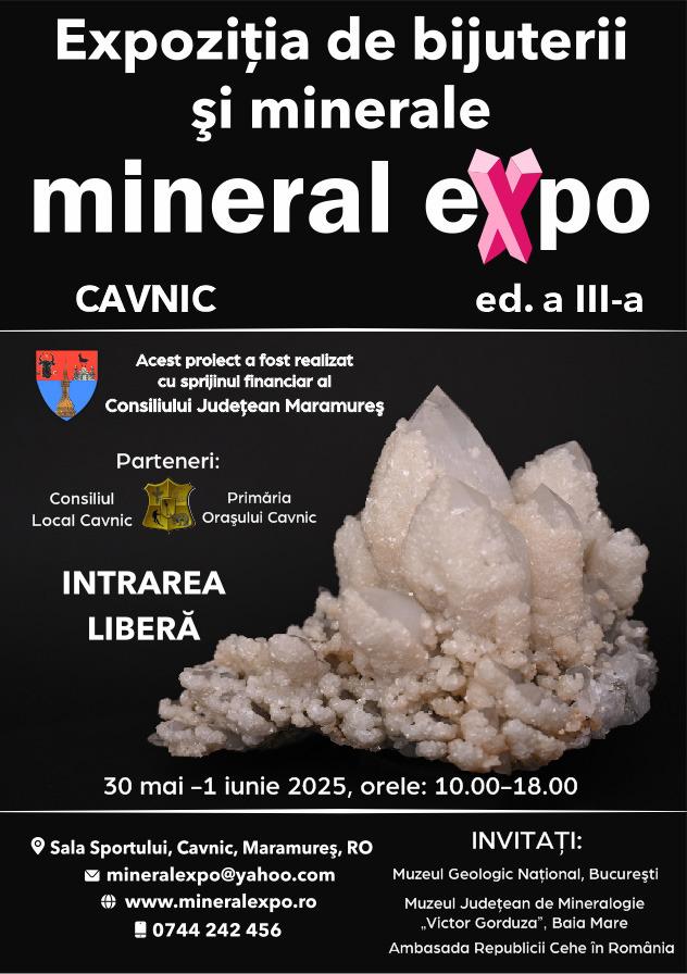Invităm toți iubitorii de frumos, pasionații de geologie și pe cei care se află în cea mai frumoasă zonă din România să treacă pragul acestui eveniment unic. „Mineral Expo Cavnic – Maramureș” este o oportunitate de a descoperi comorile subterane ale Maramureșului și de a înțelege mai bine legătura profundă dintre om și natură, se precizează într-un comunicat de presă al Asociației Mineral Expo Baia-Sprie.