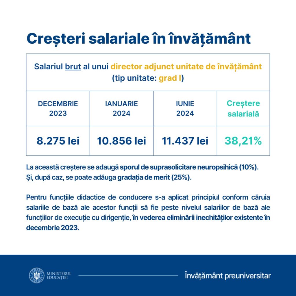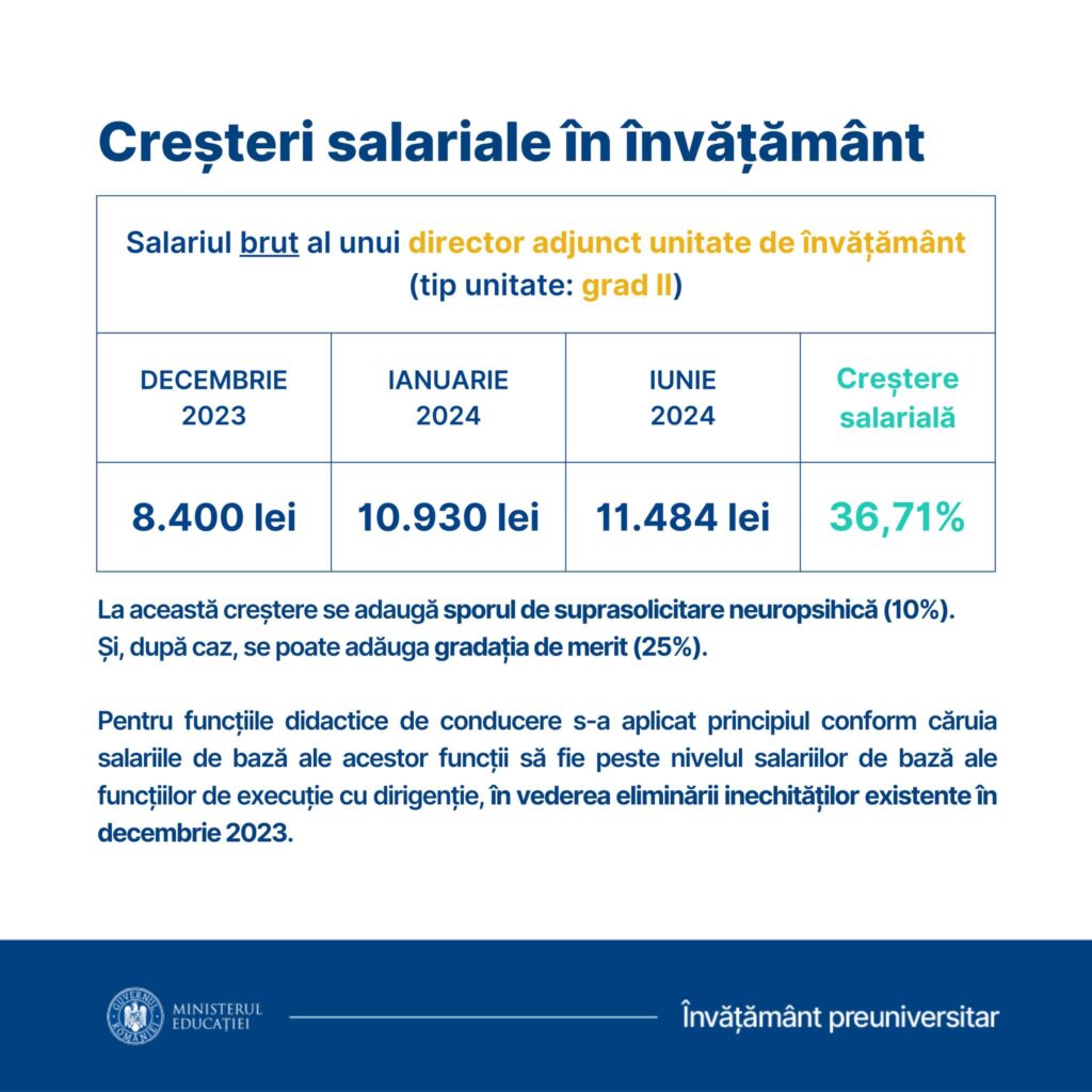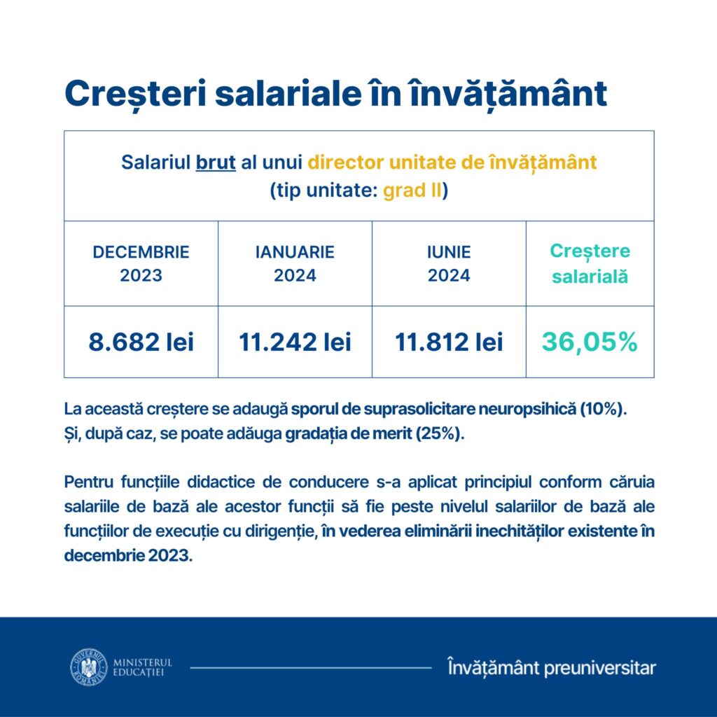 ”Prin actualul proiect de act normativ, pentru funcţiile de conducere de director în luna ianuarie 2024 este un salariu de bază minim de 10.590 lei şi un salariu de bază maxim de 11.242 lei, diferenţa între acestea fiind de 652 lei, iar în luna iunie 2024 este un salariu de bază minim de 11.260 lei şi un salariu de bază maxim de 11.812 lei, diferenţa între acestea fiind de 552 lei”, precizează sursa citată.