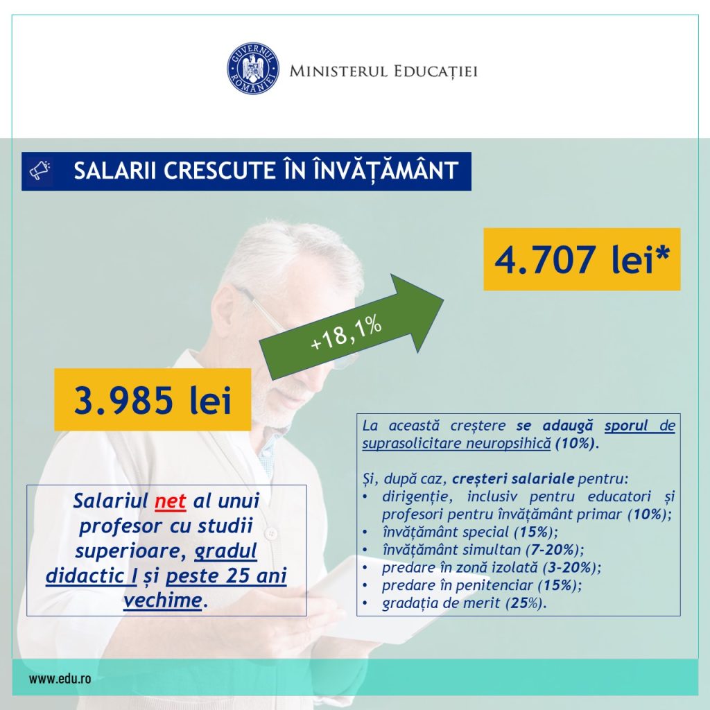 „La propunerea reprezentanţilor sindicatelor, prin Ordonanţa de Urgenţă a Guvernului 53/2023, garantăm o creştere de 1.000 de lei brut pe lună pentru personalul didactic şi didactic auxiliar şi, respectiv, de 400 de lei brut pe lună pentru personalul nedidactic. Ca mesaj: toate salariile din învăţământ cresc, niciun salariu nu scade”, a spus Deca într-o conferinţă de presă la Ministerul Educaţiei.