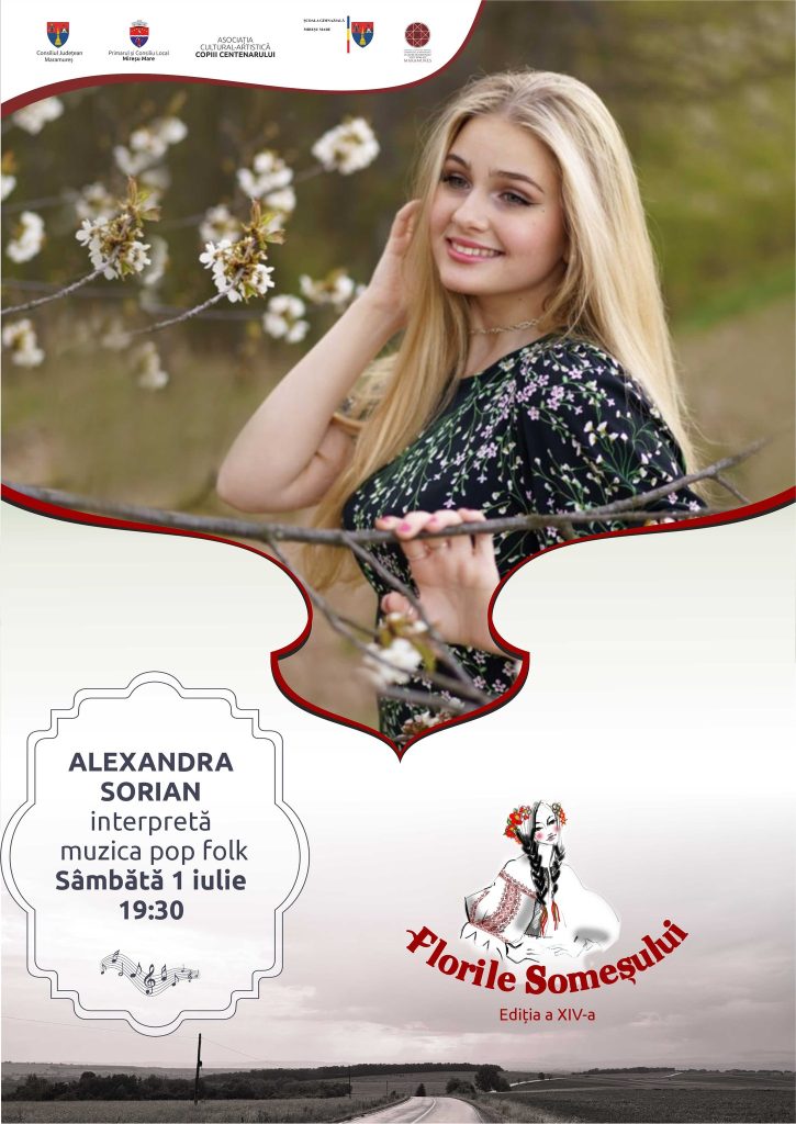 Sâmbătă, 1 iulie, de la ora 19.30, în comuna Mireșu Mare va avea loc un recital pop-folk susținut de Alexandra Sorian în cadrul evenimentului Florile Someșului.