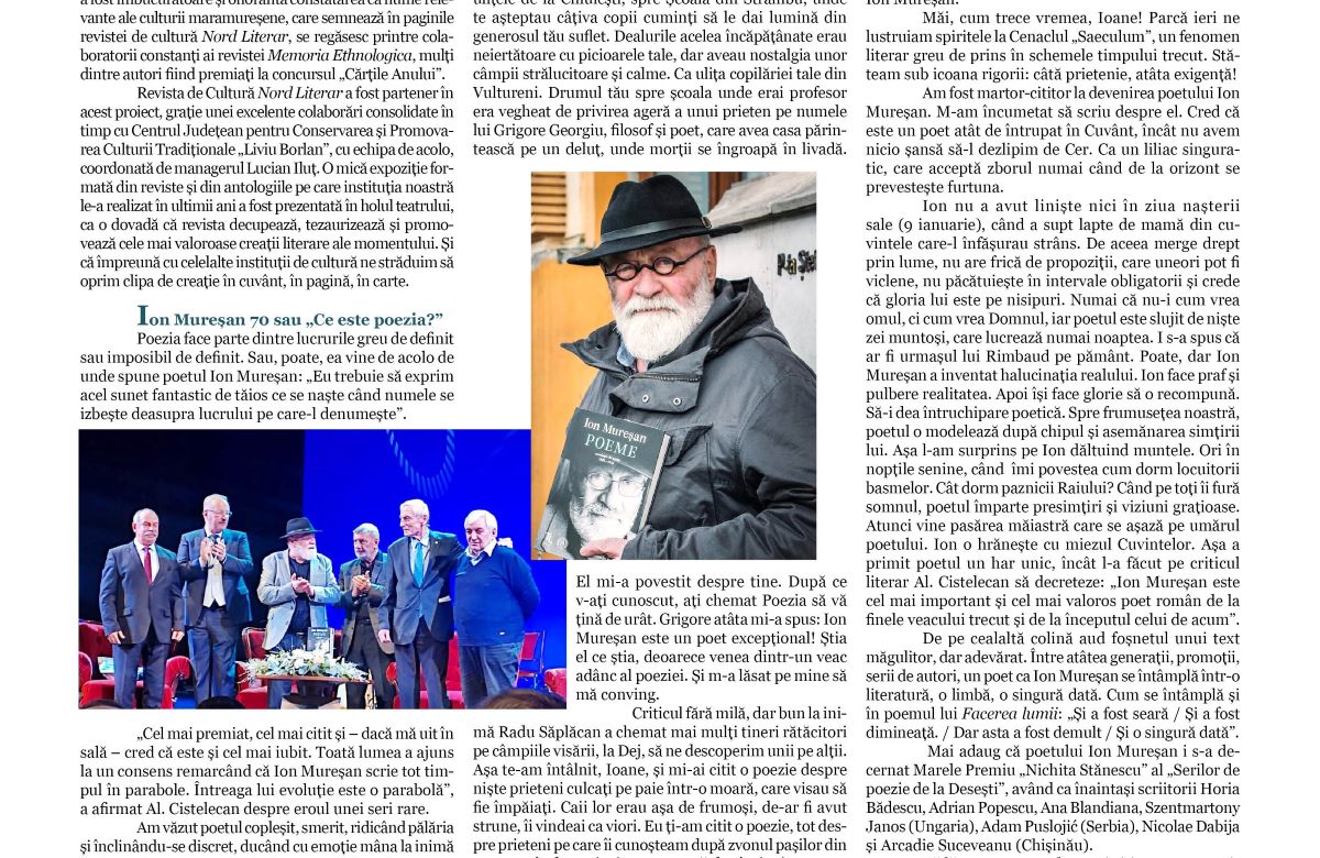 Actualitatea literară a acestei luni are în prim-plan evenimentele dedicate Zilei Culturii Naționale și aniversării poetului Ion Mureșan, la împlinirea a șaptezeci de ani, iar Gheorghe Pârja vine cu o evocare a tinereții lui Ion Mureșan.